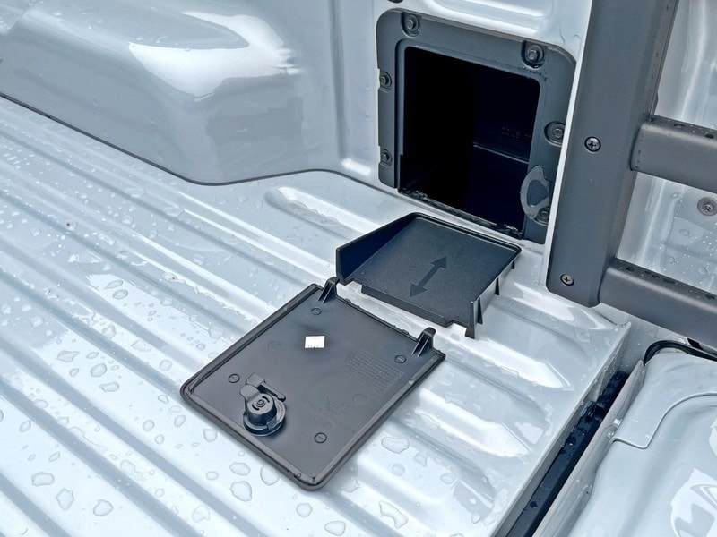 The bed of this Maverick has a handful of different tie down points, Storage Compartment and the Bed Extender.