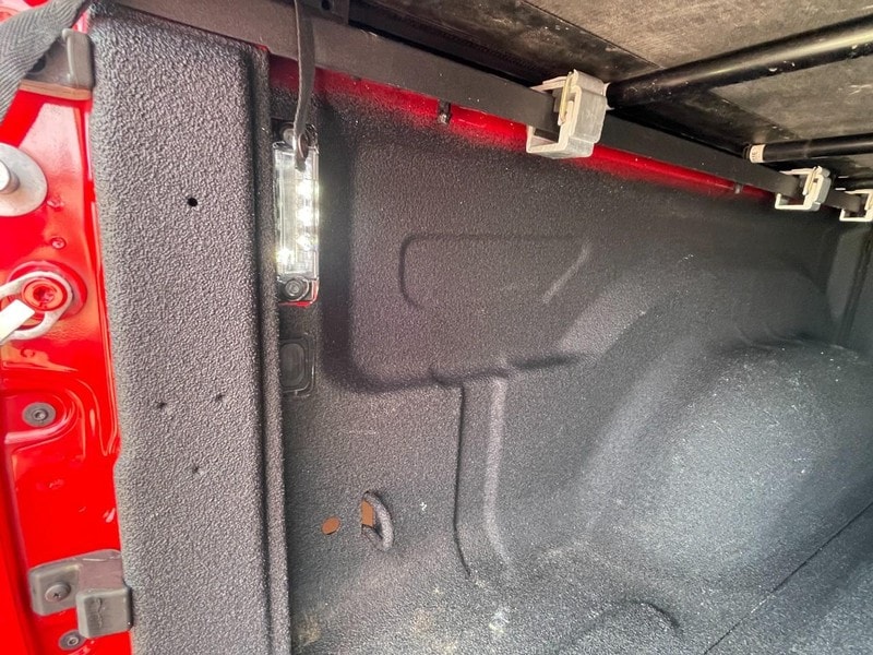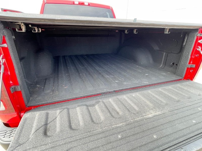 The Bed of this Ram 1500 has a Soft Tonneau Cover, Spray In Bedliner and LED Lighting.